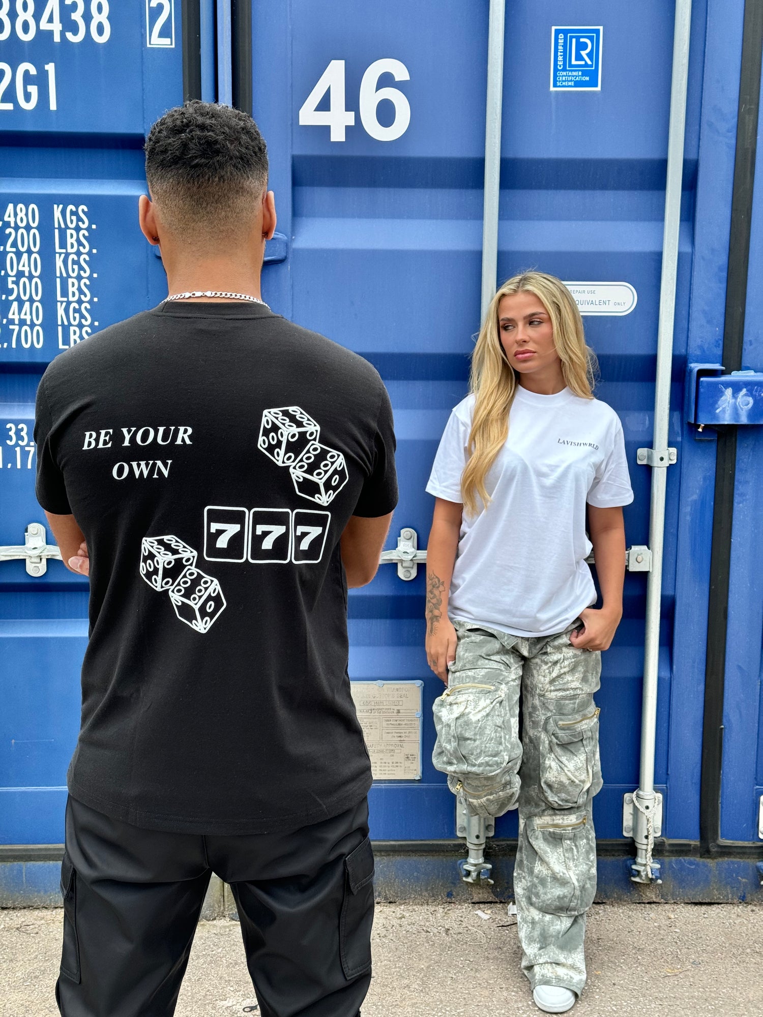 This is our new 200 GSM unique black & white "BE YOUR OWN 777" T-shirt. This T-shirt is more than a T-shirt, it's more about, against the odds roll the dices and always back yourself. This T-shirt is brilliant material & lightweight, perfect for a summer day & warm enough to get you through winter whilst looking Lavish.